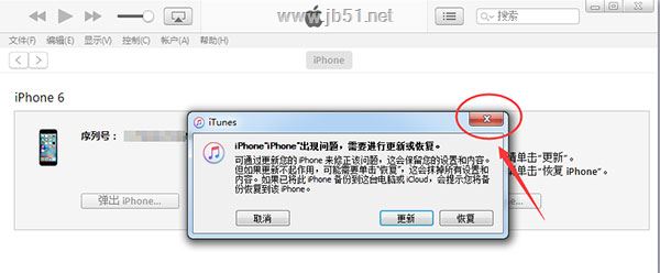 2.将 iTunes 更新到最新版(iTunes下载地址),打开 iTunes 并连接设备,此时iTunes会识别到一个处于恢复设备的iPhone,点击右上角的关闭按钮。