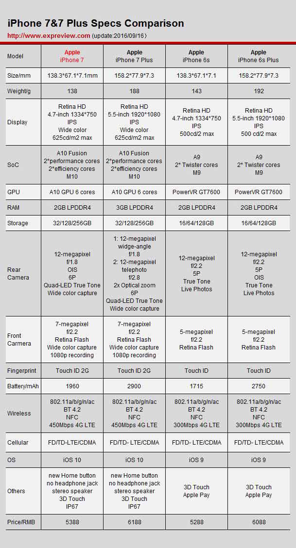 iPhone 7与7 Plus、6s、6s Plus规格参数对比