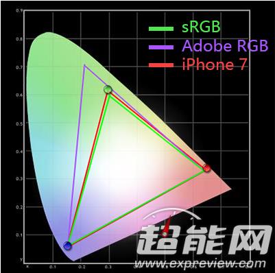 iPhone 7上依旧是4.7英寸、1334*750分辨率、326ppi的Retina HD显示屏,这在如今动辄2K屏的手机市场显得“寒碜”,这次屏幕改进在亮度提升了25%,最大可以达到625 cd/m2(nit),另外新显示屏还有更大亮点为支持Display P3广色域,这在苹果的iMac、iPad Pro都已有应用,现在来到了iPhone上。