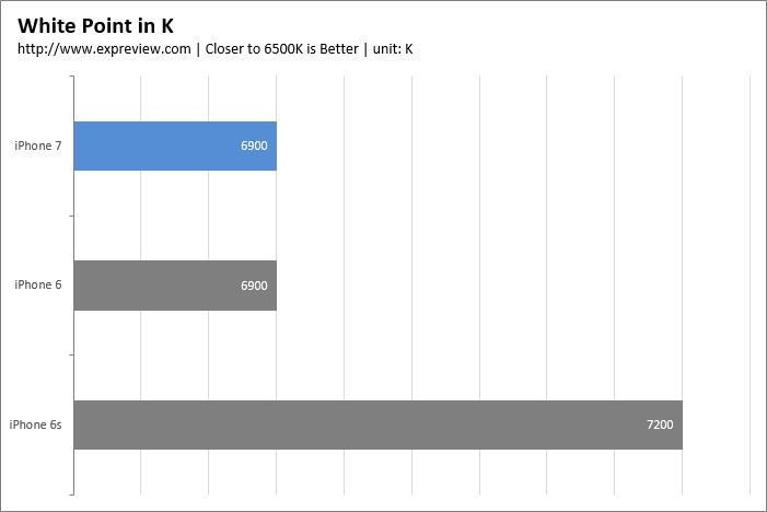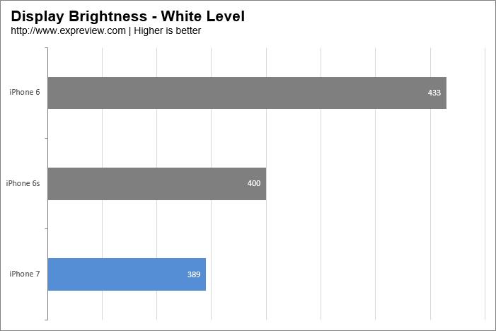 iPhone的屏幕部分向来是手机屏幕的标杆,iPhone 7这块屏幕的色准、色温都很优秀,但亮度并没有达到苹果宣称的625cd/m2,可能要在极高强光下才能激发,而在手动调的范围内只在400cd/m2左右,与iPhone 6s、6接近。