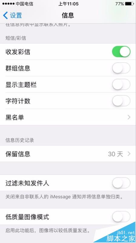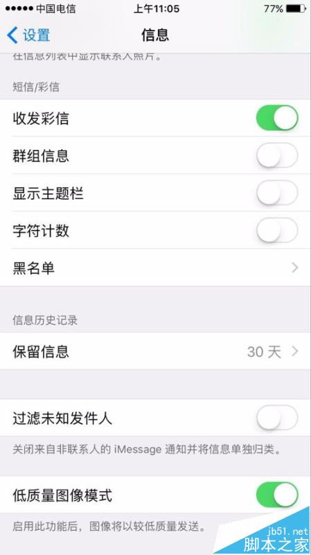 IOS10多了一个默认的信息图片低质量传送,只要不关闭,传出去的图片会默认低质量,所以如果需要高质量的照片,必须关闭这个功能。