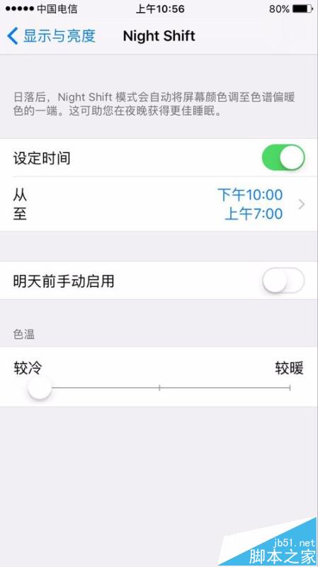 IOS10多了一个色温的设置,可以通过以下几个方法来设置夜晚模式的色温度。