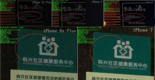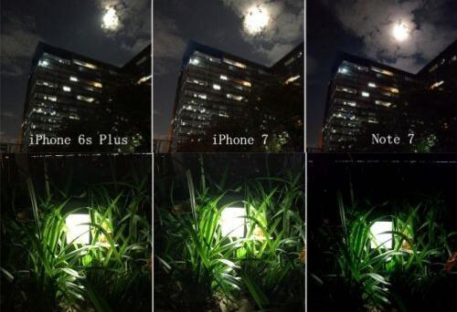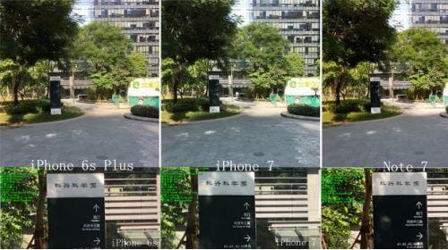 弱光环境对比图看,iPhone7比iPhone 6s Plus的暗光、超弱光下的画质有所提升,而Note 7的画面纯净度高,噪点少,但是由于该机过于积极的涂抹算法,将噪点部分进行了大面积的涂抹,使得失去了该有的细节。