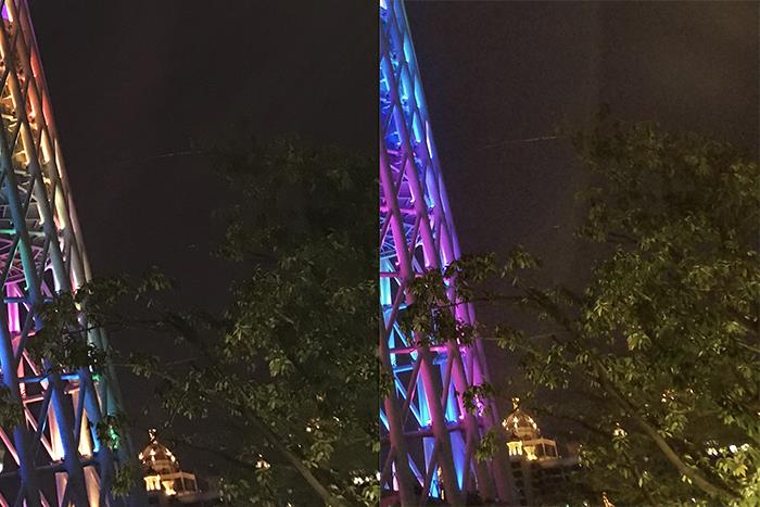 夜景方面,两者画面都很亮,Galaxy Note7的Dual Pixel突显出优势,画面更亮,对焦速度几乎和白天一样快,iPhone 7 Plus则有明显的对焦、快门变慢,好在最终出来的照片是成功拍到的。