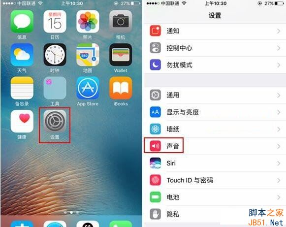1、首先在已经运行的iOS10的苹果手机设备系统依次进入『设置』---『声音』选项,如下图所示。