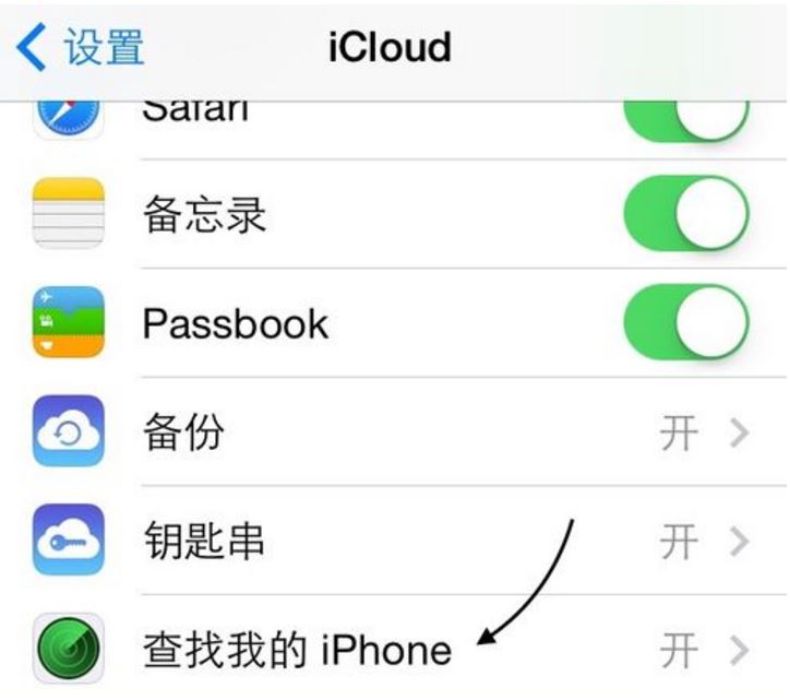 4、当用AppleID登录iCloud服务以后,请确保功能列表中的;查找我的iPhone;已经开启。