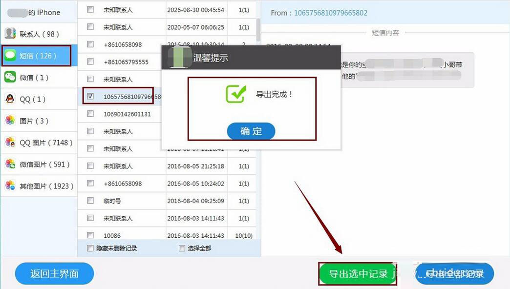 最后,我们只需要勾选要恢复的短信,点击“导出选中记录”,就可以完成恢复了。