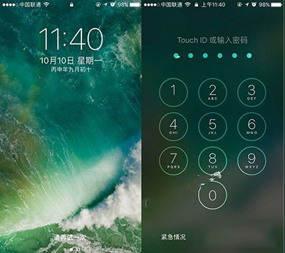 iOS 10改用按下主屏幕按钮解锁,简单来说就是使用录制了指纹的手指,直接按下屏幕下方的Home键,就可以快速解锁屏幕,进入主界面了,如下图所示。