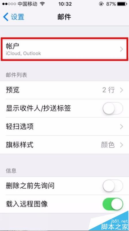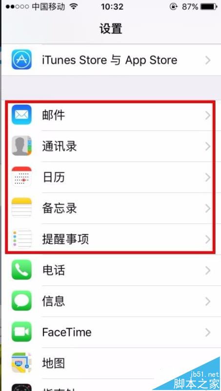 1、首先需要删除已经添加好了的outlook账户,进入设置,选择如下5个选项中的任意一个,例如选择“邮件”
