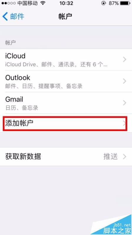5、现在需要换一种方法重新添加outlook账户,同样进入“邮件”——“账户”再选择“添加账户”