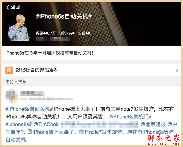 发生问题的用户反应:手机在不同电量情况下(手机电量80%左右同样会出现),均会不定期出现自动关机,并伴有电量快速减少的现象(一分钟掉电百分之一及其以上)。这个问题在百度和微博都搜得到,并且目前排在微博数码类热搜关键词第三位。