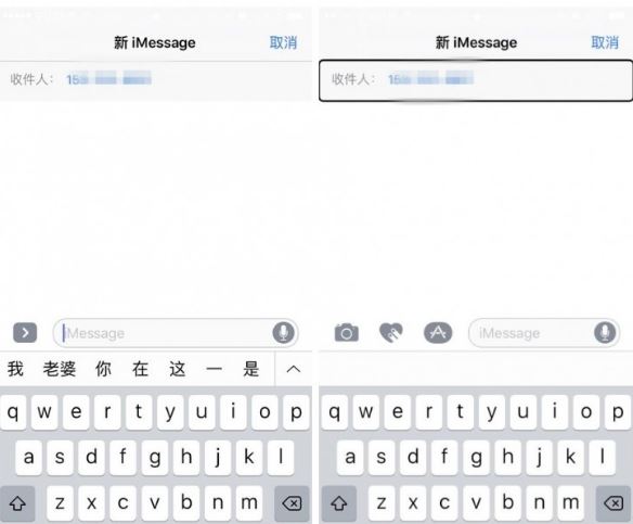 4.按 HOME 键回到新消息界面,使用 VoiceOver 进行操作,成败关键在于 VoiceOver 是否打开,如果没有启用这个功能,新消息界面的地址栏将无法编辑。如左右图对比,右图是可以编辑的状态。(另外,建议你提前学习下 VoiceOver 怎么使用,不然操作难受到哭,不要问编辑怎么知道的。 )