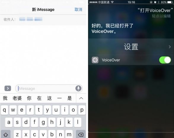 3.此时,你会进入一个编辑新信息的界面(左图),长按 HOME 键,会进入到 Siri 界面(右图),要 Siri 打开 VoiceOver 。VoiceOver 是语音引导功能,如果此前没有打开过这个功能,那么 Siri 无法打开这个功能,自此后续无法开展,故事会大结局。如果曾经打开过,好戏在后头。打开 VoiceOver 很简单,打开“设置”,进入“通用”,再进入“辅助功能”。切记,记得关掉。