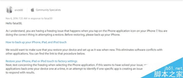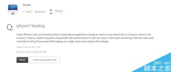 现在有不少iPhone 7用户在苹果官方论坛吐槽,自己的手机出现了莫名系统问题,具体症状是电话应用经常会卡死(查看通话记录、设置电话应用等操作都能卡死。),只能通过双击Home按键进入多任务界面后,向上滑动手指硬关闭才能强制解决。