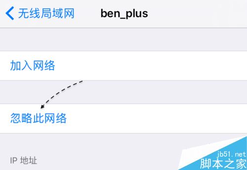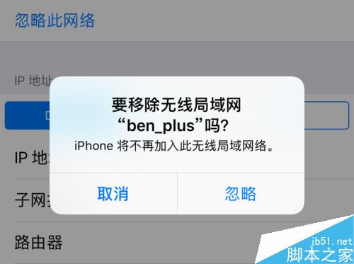 接着再点击「忽略此网络」选项,这的功能是把这个以前在 iPhone 上连接过的信息从手机上删除。