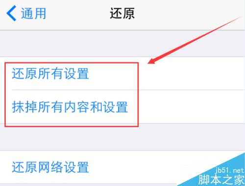 因为在手机上还原出厂设置的时候,也是需要输入访问限制的密码。所以如果我们忘记了访问限制的密码,我们是无法直接在手机上还原出厂设置的。依次打开手机【设置】——【通用】——【还原】,不管是我们选择【还原所有设置】或者【抹掉所有内容和设置】选项,不仅需要输入手机锁屏密码,还需要输入访问限制的密码。如下图所示。