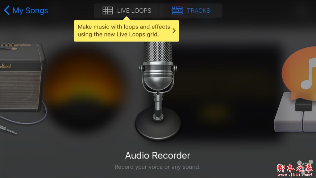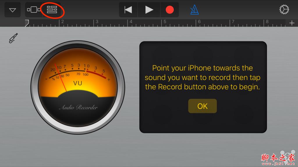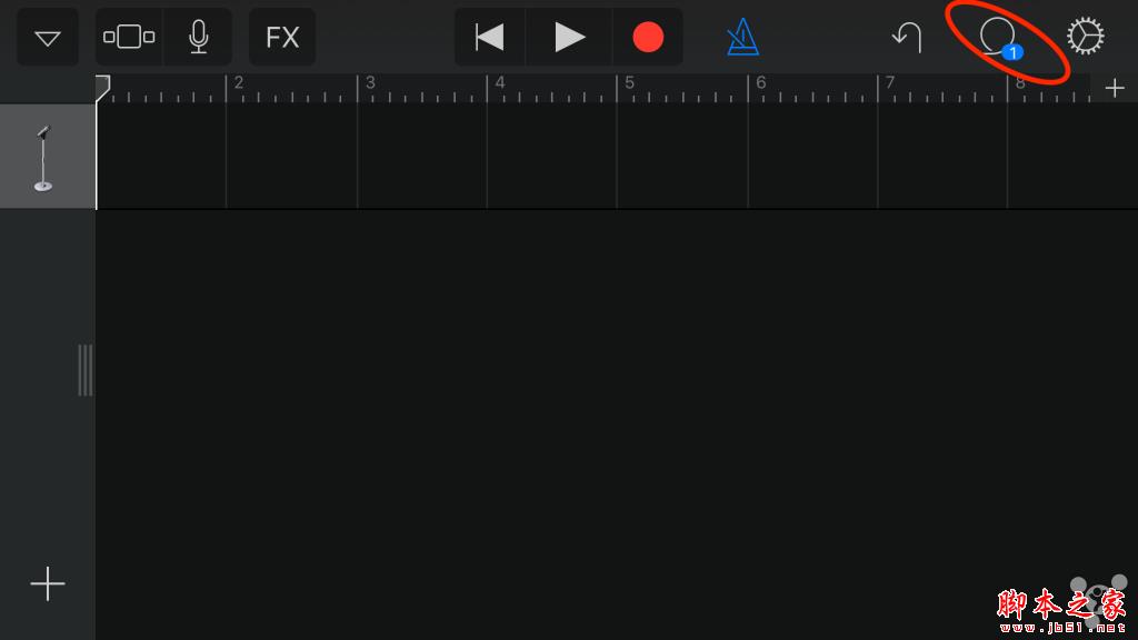 这时候可以打开 GarageBand 了,点击录音,再按一下左上角有两个按钮,点击右边那个。