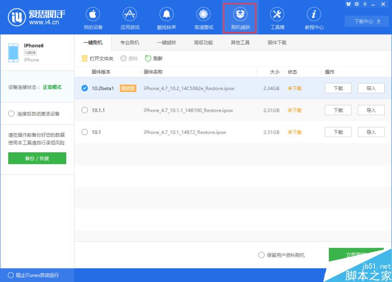 1、首先下载安装最新版爱思助手,用数据线把移动设备连接到电脑;点击上方“刷机越狱”进入到“一键刷机”界面,连接成功会自动匹配固件;