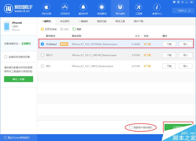 如果您已下载固件可以点击“导入”,再点“立即刷机”;如果您不希望设备资料被清空,请勾选“保留用户资料刷机”选项。