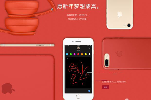 此次活动已抢占苹果中国区官网第一帧宣传图,满屏中国红年味十足。宣传页面上不仅有红色款Apple Watch表带、红色iPhone、iPad保护壳、Beats Solo3红色版耳机,更是在手机里面贴出“福到了”这种中国传统新春元素。