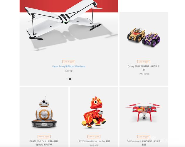 打折促销之外,这次苹果还推出Only at Apple的新年特别版第三方配件产品,包括:Tech21 Evo Elite手机保护壳、mophie新春版移动电源、UBTECH Jimu Robot LionBot积木机器人套装、Galaxy ZEGA战斗玩具农历新年版以及大疆Phantom 4航拍飞行器的新春限量版。