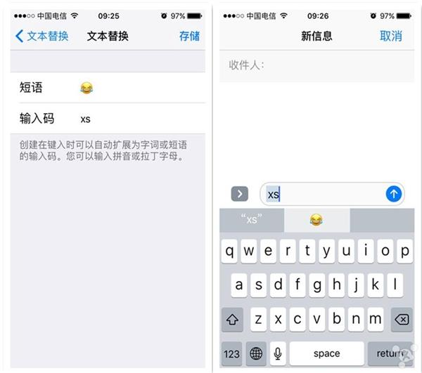 现在只要通过一个小设置,就可以摆脱繁切换键盘的过程。进入设置界面——通用——键盘——文本替换,点击右上角的“+”符号,将常用表情添加在短语,下面的输入码就是为表情设定的特定字符。