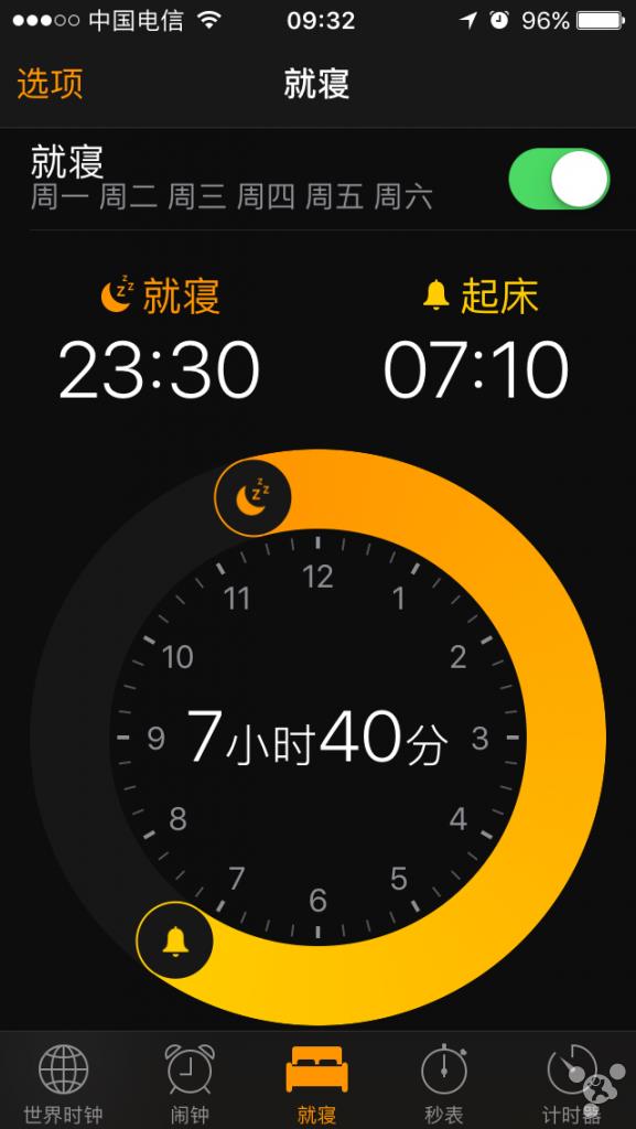 一个更加智能的闹铃系统,并且可以追踪你的睡眠。打开时钟应用,选择最中间的标签,按照自己的睡眠时间进行设置后,就可以启用了。