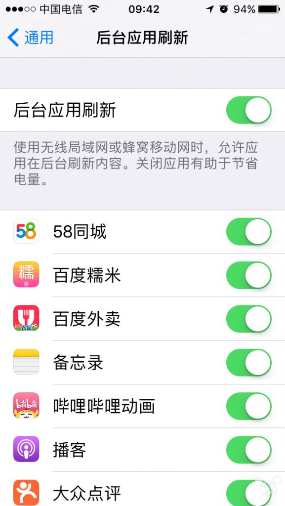 所以找到设置——通用——后台应用刷新选项,将其关闭可以很好的减轻电池的负担。