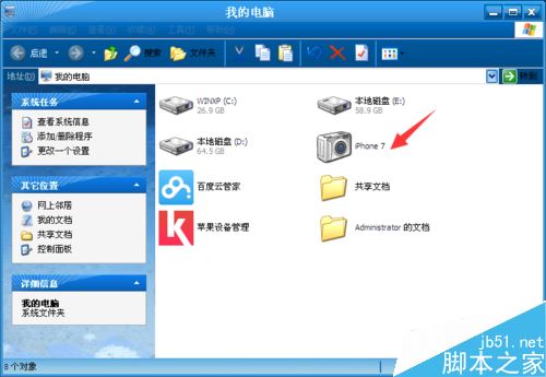 步骤三、然后打开【我的电脑】,电脑上面会自动识别出iPhone相机,点击“iPhone”相机图标。(如图)