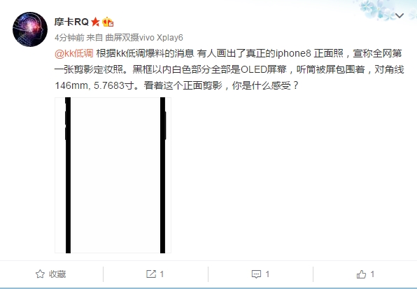 今天,业内人士@摩卡RQ根据@kk低调的爆料。画出了真正的iPhone 8正面照,宣称全网第一张剪影定妆照。