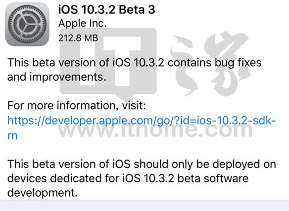 在此前的iOS 10.3.2 Beta2中已修复了此前Beta1中无法连接VPN的Bug。此次更新包大小在200MB左右,稍后IT之家会为大家带来固件更新下载大全。