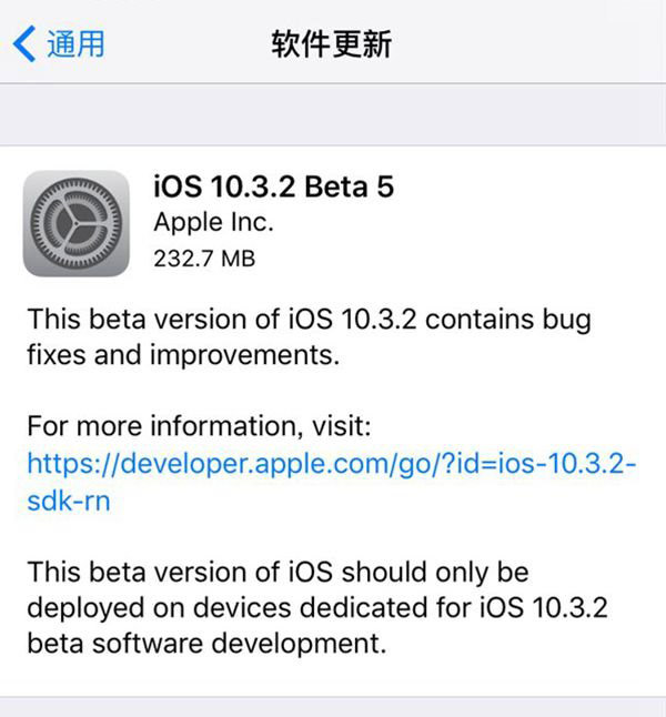 4月28日消息 今天早上早些时候苹果推送了iOS10.3.2第五个开发者预览版,本次更新距离上次Beta更新发布只有三天的时间,本次更新固件包大小为232MB左右,主要是Bug的修复以及性能的提升。