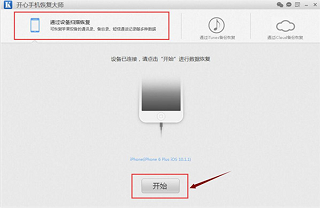 第三步、下载完成就可以直接运行开心手机恢复大师了,这时候我们可以看到主界面上有三种不同的恢复方法可以选择,借助第一模式找回删除的苹果手机短信的话,当看到显示“设备已连接”的字样之后,我们就可以点击【开始】继续了;