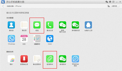 第四步、跳转进入数据项图标界面,需要找回删除的短信就点击【短信】图标;需要恢复丢失的iMessage短信中的图片或者语音文件则点击【短信附件】即可;