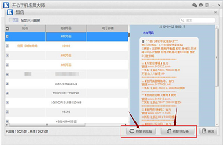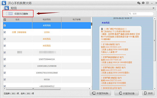 第五步、点击图标之后,开心手机恢复大师系统会进入自动分析和识别的状态,扫描结束就可以预览到结果,可以看到界面左侧是发件人的信息,右侧是具体的短信内容;点击【仅显示已删除】看到的橙色字体的数据均为已删除的短信内容;