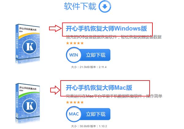 步骤一:登录开心手机恢复大师的官网(网址:www.kxbox.com),然后在官网上找到软件并点击下载,下载时要注意Windows和Mac两个版本。