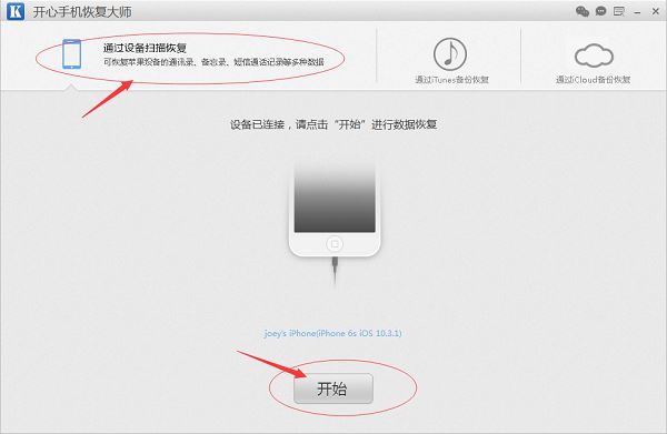 步骤二:下载安装结束后,连接手机到电脑上。在界面中软件的默认界面显示的是第一种数据恢复模式:通过设备扫描恢复,而其他两种模式分别是:通过iTunes备份恢复,通过iCloud备份恢复。因为短信属于文本数据,我们的第一种数据模式无须备份就可以使用,所以建议大家使用第一种数据恢复模式。然后,点击开始进入扫描状态,扫描结束后进入下个界面。