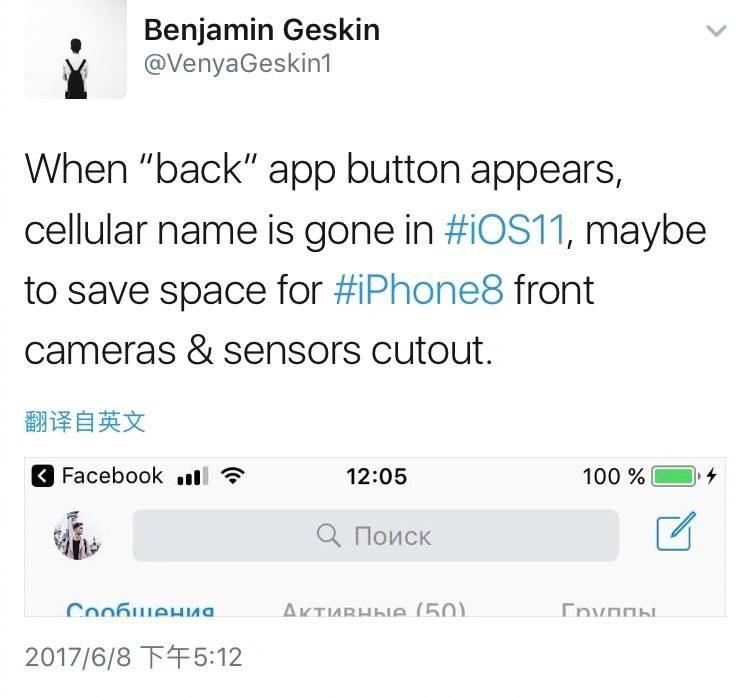但是来自国外的知名设计师Benjamin Geskin在推特上评论说,iOS的这一改动也许是为了给iPhone 8的前置相机和传感器让位置。