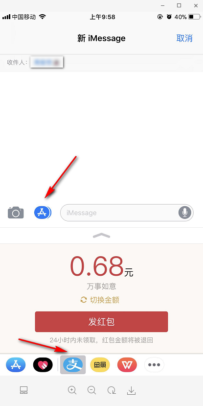 9 月 19 日更新的支付宝正式支持在 iMessage 内发红包了。不过,目前只支持发随机金额的红包。操作方法如下图所示: