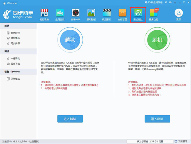 3.备份完成后,点击【刷机越狱】,进入刷机界面