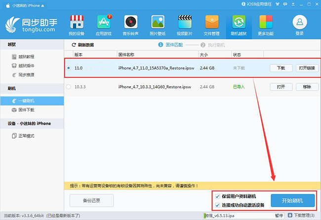 4.同步助手会自动为设备匹配可刷机的固件,点选“iOS11”并勾选“保留用户资料刷机”和“连接成功自动激活设备”,然后点击【开始刷机】(备注:iOS11正式版预计是在 9 月 19 日推送,届时同步助手会第一时间上架 iOS11 正式版固件)