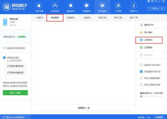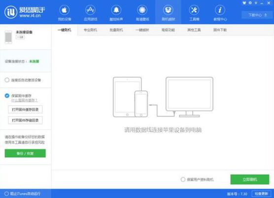 1、首先下载安装最新版爱思助手(请务必更新到爱思助手最新7.30版本或以上版本,否则无法刷iOS11正式版),用数据线把移动设备连接到电脑;点击上方“刷机越狱”进入到“一键刷机”界面,连接成功会自动匹配固件;