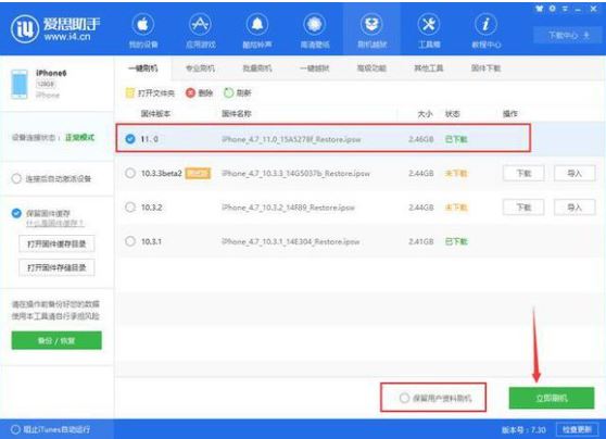 2、在可刷版本中选择您要刷的 iOS 版本,点“立即刷机”,之后爱思助手会自动帮您下载固件并刷机;