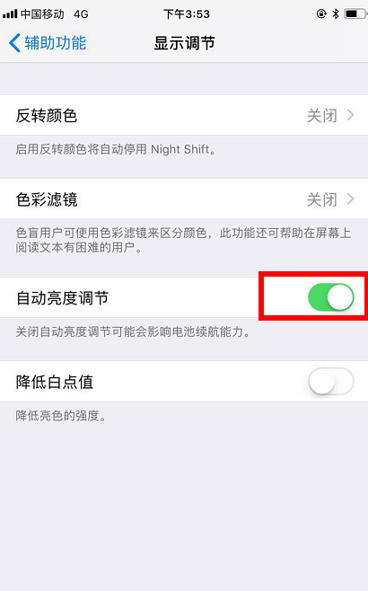 2.点击设置>通用>辅助功能>显示调节,勾选自动亮度