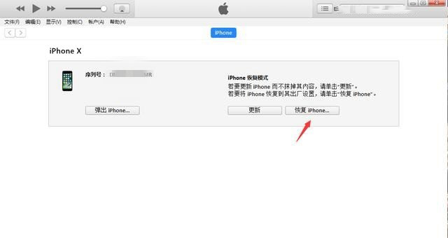前面操作步骤是一样的,iPhone X要进入DFU模式,首先必须先将iPhone X连接到电脑iTunes,然后在关机状态下,持续按着「电源键」大约3s左右,iPhone X没有显示任何画面,不过iTunes却显示有iPhone X在恢复模式,此时就代表你的苹果X手机成功进入DFU模式了。