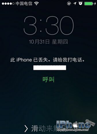 7. 指令生效后,iPhone便会被锁定在锁屏界面,并自动显示刚才设置的电话号码与信息!在锁定手机的期间,除了拨打指定的联系电话就无法进行任何操作,连通知栏与控制中心都被禁止呼出。