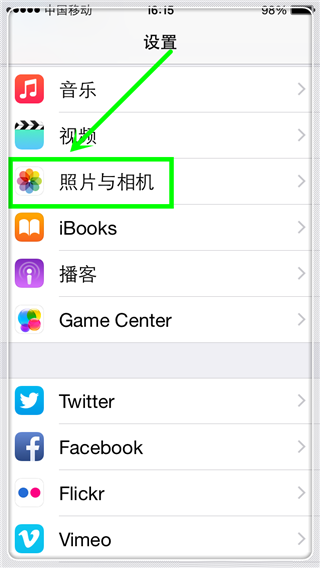 2、打开“设置”后,用手指往下移到“照片与相机”。