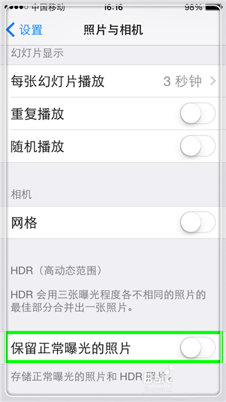 4、进入界面后,移到该界面最下方,关闭“保留正常曝光的照片”按钮。