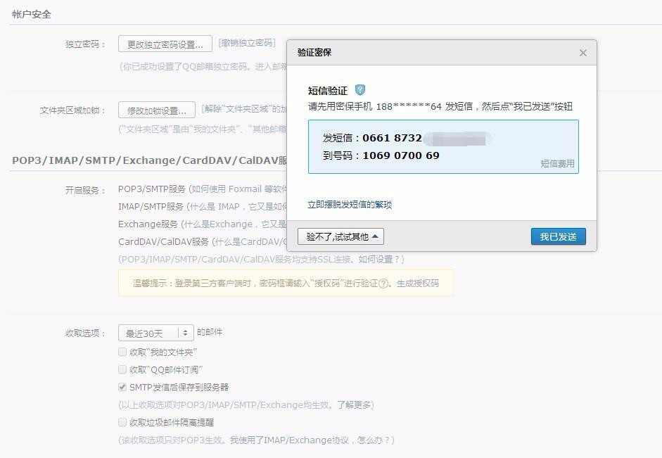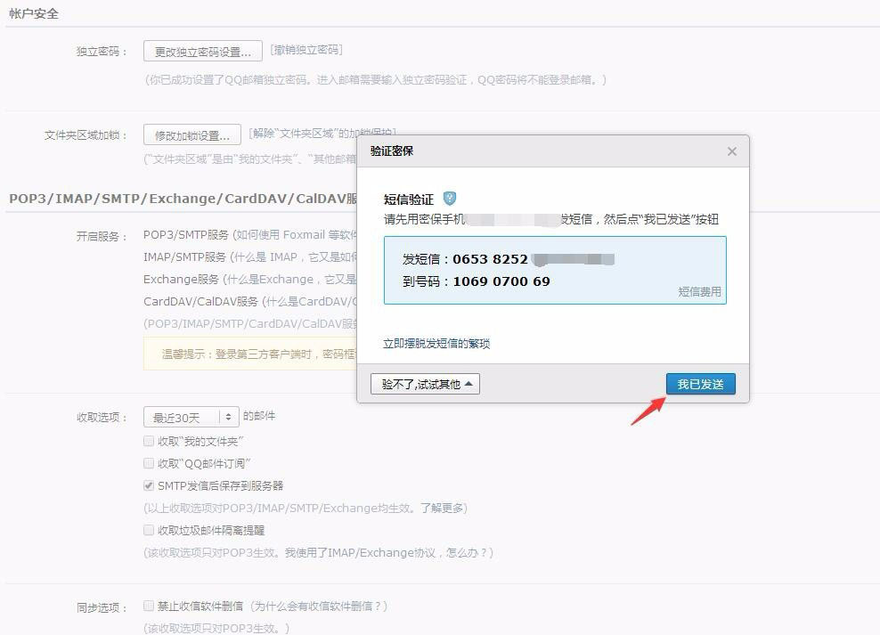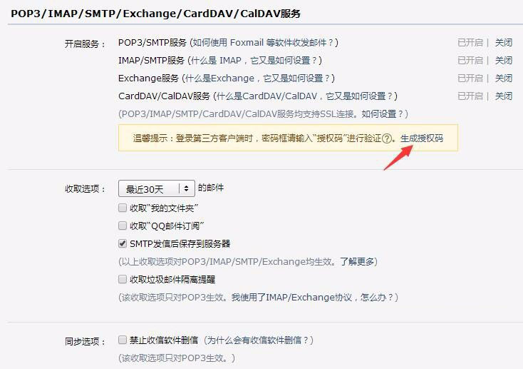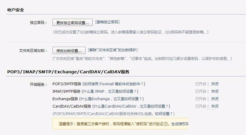 注意设置QQ邮箱独立密码的时候开启 POP3/IMAP/SMTP/Exchange/CardDAV/CalDAV服务。