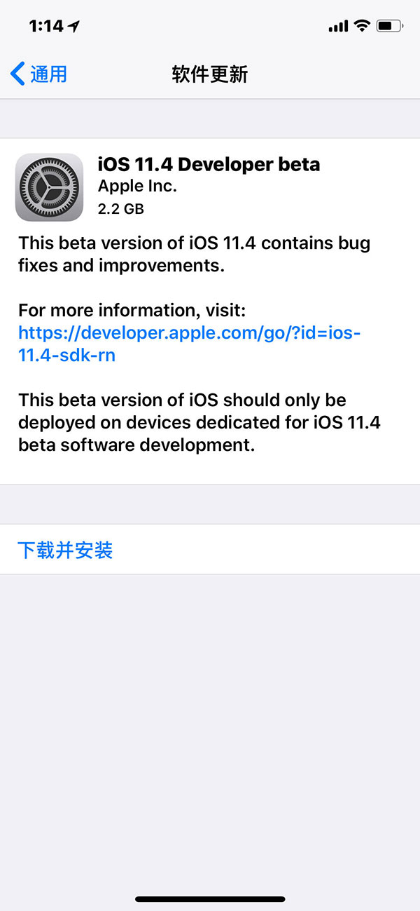 苹果iOS 11.4 beta 1开发者预览版固件的大小在2.2GB左右。